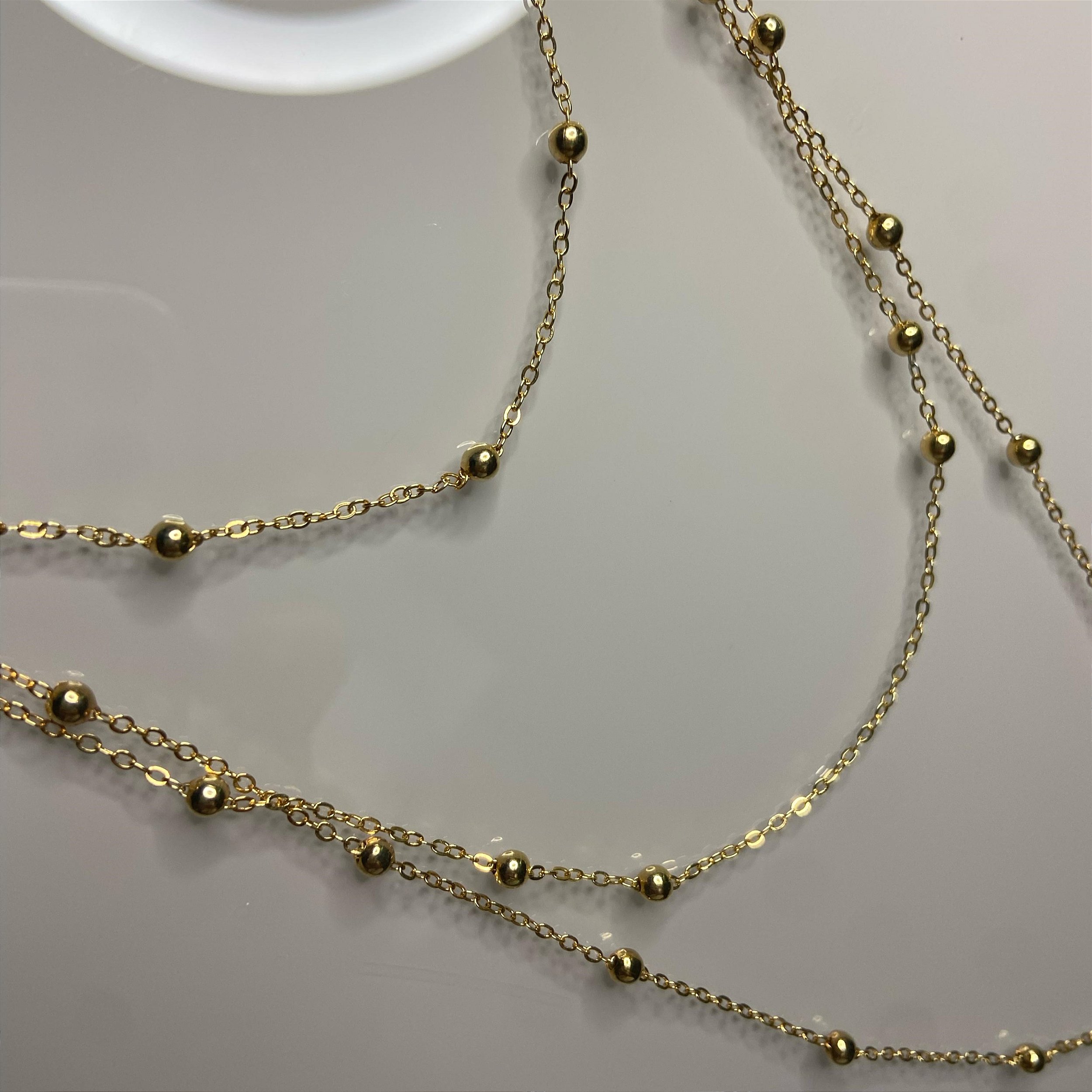 Colar alongado delicado com esferas douradas intercaladas na corrente. Versátil e atemporal. Folheado a 2 milésimos de ouro. Peça hipoalergênica, livre de níquel, ideal para quem busca elegância com segurança e durabilidade.