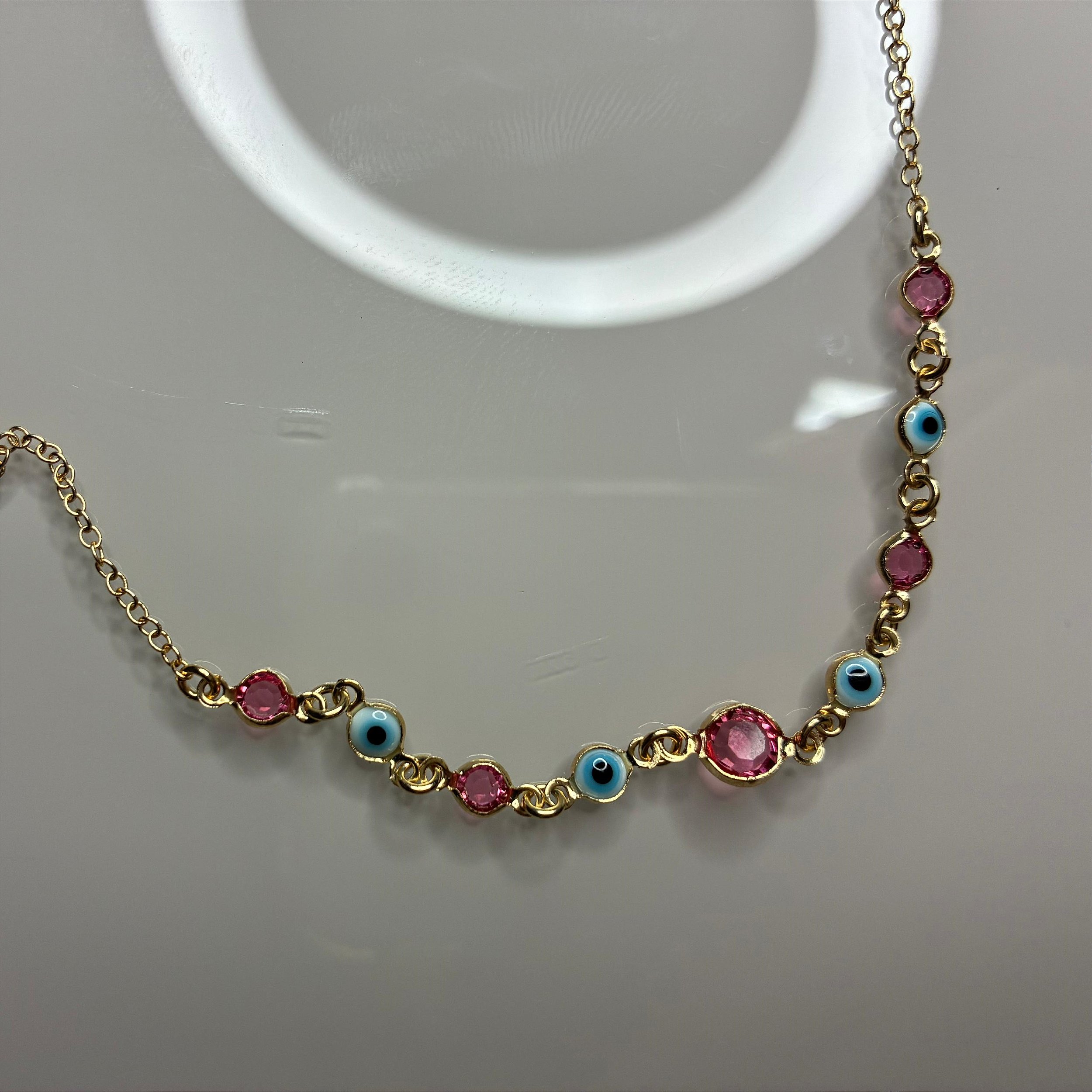 Colar delicado alongado com pingentes de olho grego esmaltado, folheado a 2 milésimos de ouro. Peça hipoalergênica, livre de níquel, ideal para quem busca elegância com segurança e durabilidade.